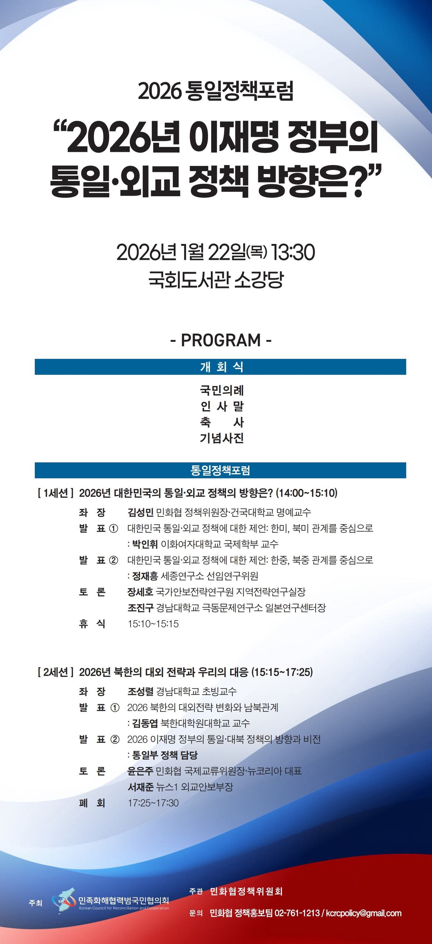 민화협은 새해를 맞이하여 국회 외교통일위원회 소속 국회의원과 공동으로 <2026 통일정책포럼>을 개최합니다. “2026년 이재명 정부의 통일·외교 정책의 방향은?”를 대주제로 민간 차원에서 한반도 정세를 분석하고 현 정부에게 통일·대북 정책을 제언하는 자리를 마련하고자 합니다.