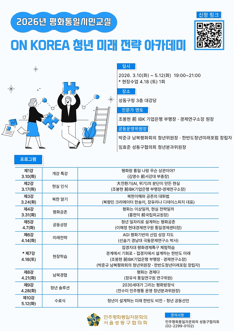 민주평화통일자문회의 성동구협의회(회장 권일수)는 청년 세대가 남북 평화와 공존, 통일 문제를 자신의 삶과 선택의 문제로 함께 고민할 수 있도록 돕는 「ON KOREA 청년 한반도 미래 전략 아카데미」를 오는 3월 10일부터 5월 12일까지 개최할 예정으로, 현재 참가자를 모집하고 있다.
